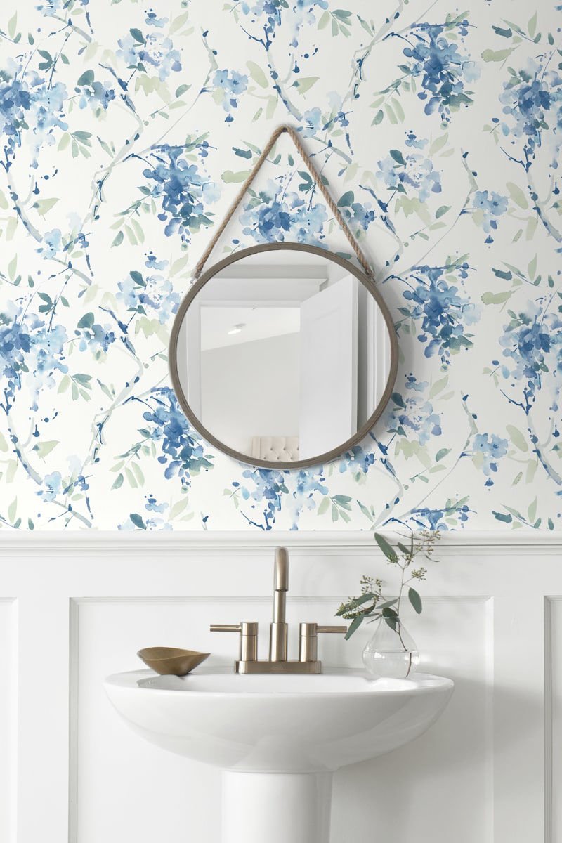 Blossom Mural – Sky Blue | Blues Florals, Botanicals and Tropicals Wallpaper for Half Bath, Office, and Entryway