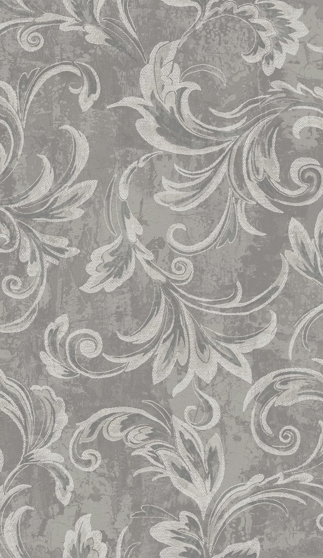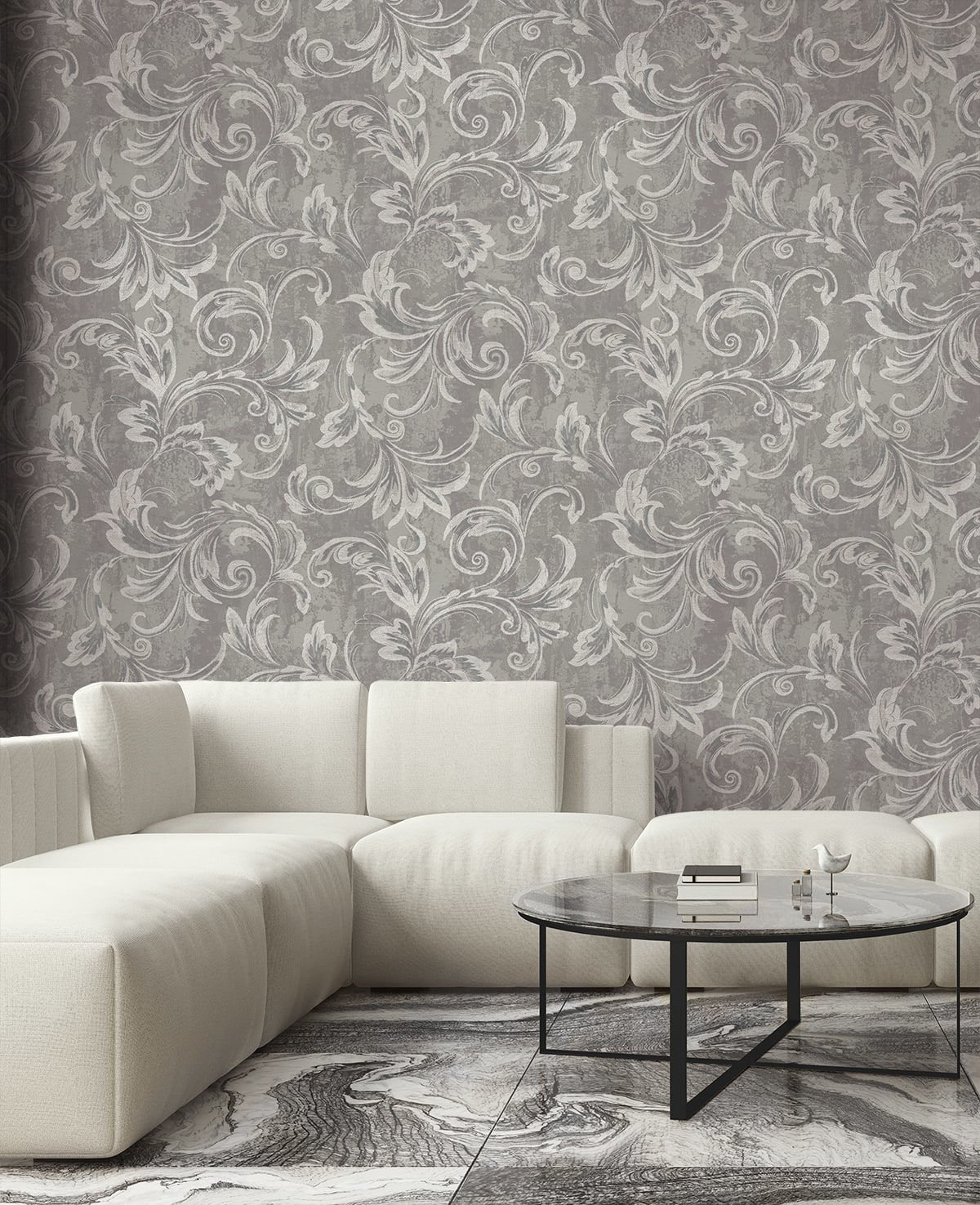 Aura Scroll – Silver, Gray, and Ivory | Grays Damasks and Scrolls Wallpaper for Living Room, Dining Room, and Accent Wall