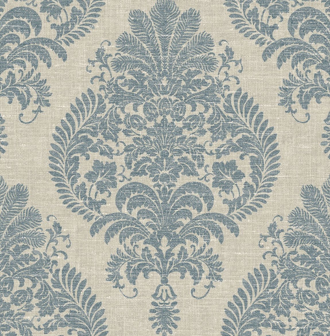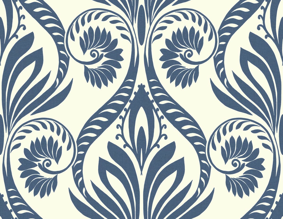 Antigua Damask – Air Force Blue and Alabaster | Blues Damasks and Scrolls Wallpaper for Accent Wall, Living Room, and Half Bath