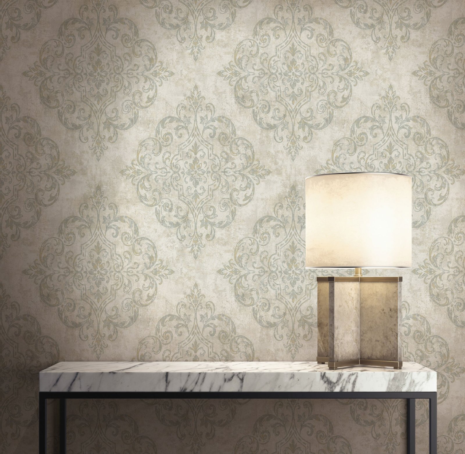 Classical Damask – Metallic Toasted Marshmallow | Warm Neutrals and Beiges Damasks and Scrolls Wallpaper for Entryway, Kitchen, and Half Bath