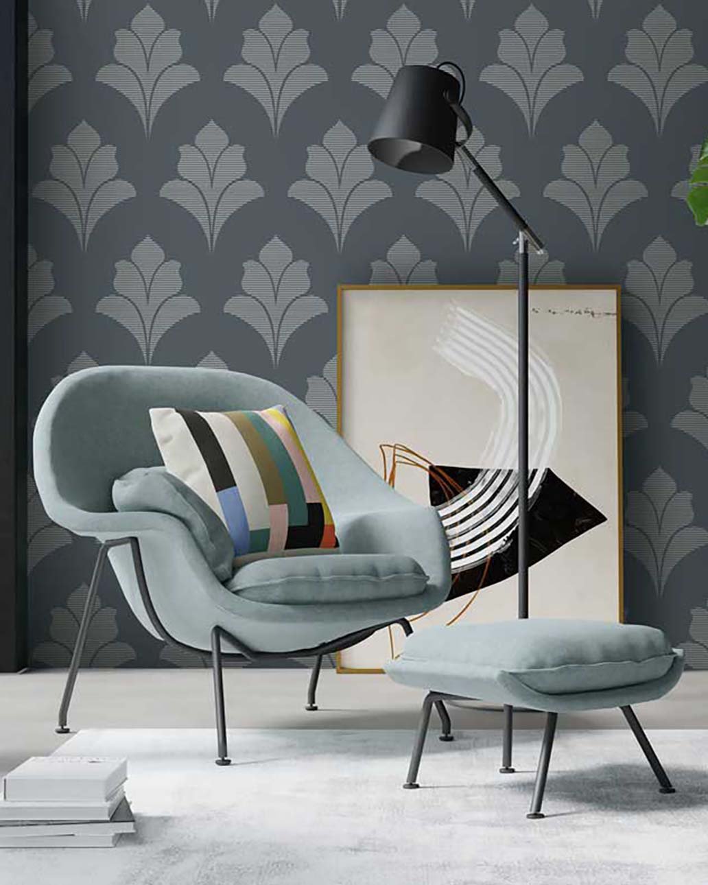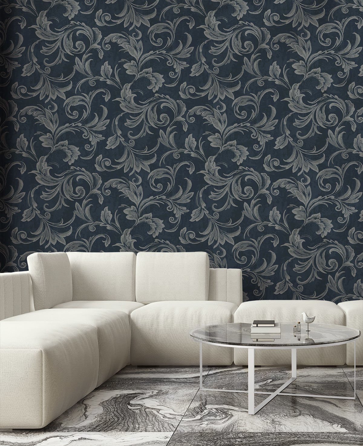 Aura Scroll – Navy, Silver, and Gray | Blues Damasks and Scrolls Wallpaper for Office, Kitchen, and Entryway