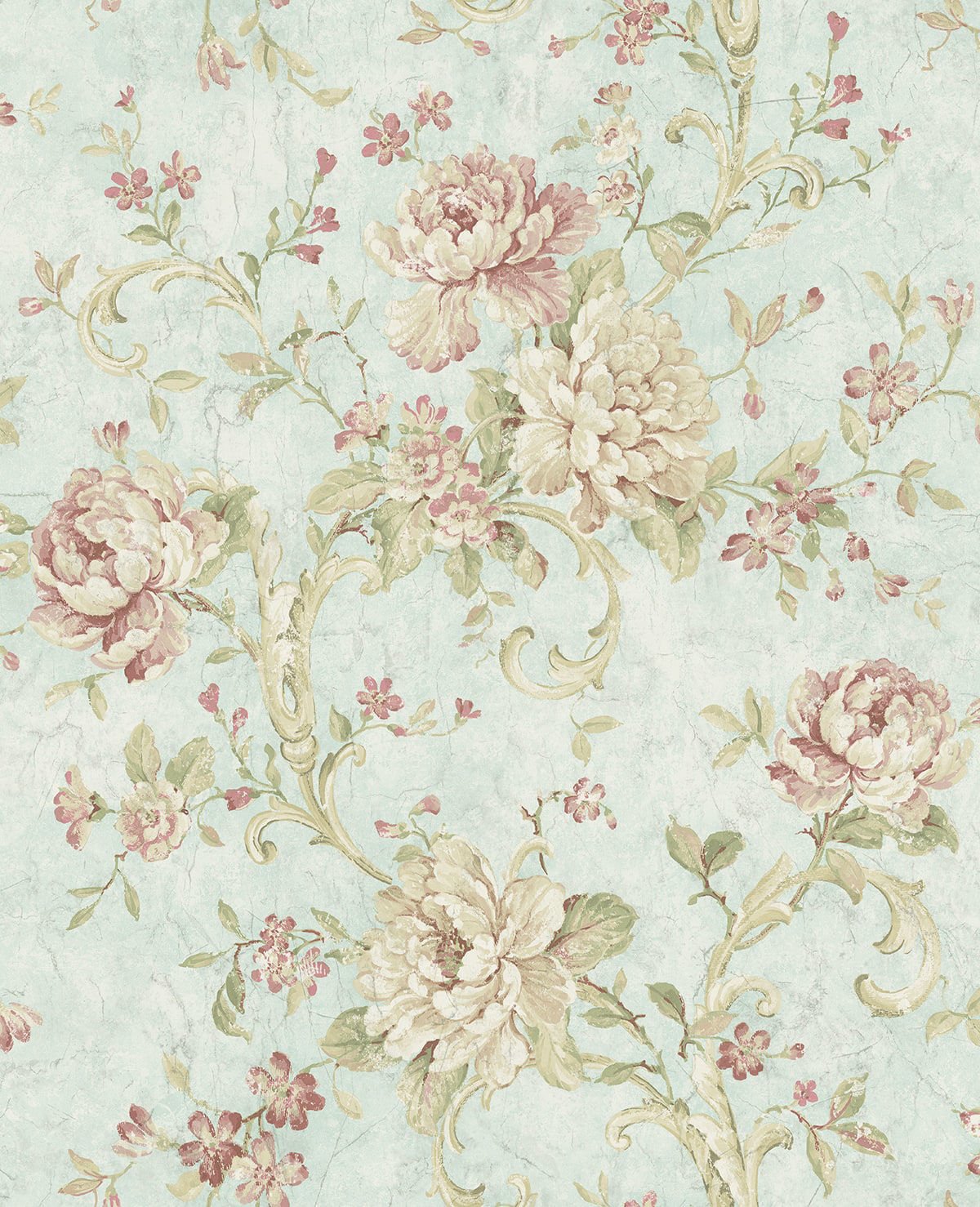 Floral Scroll – Sky Blue and Rose | Blues Damasks and Scrolls Wallpaper for Half Bath, Living Room, and Powder Room