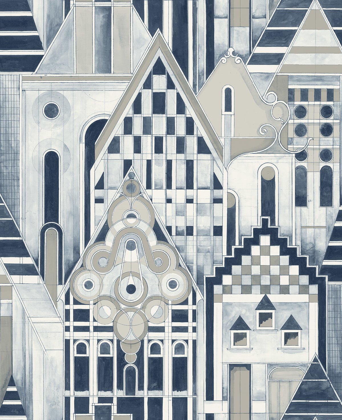 Art Deco Village | Blues Architecturals Wallpaper for Entryway, Dining Room, and Kitchen