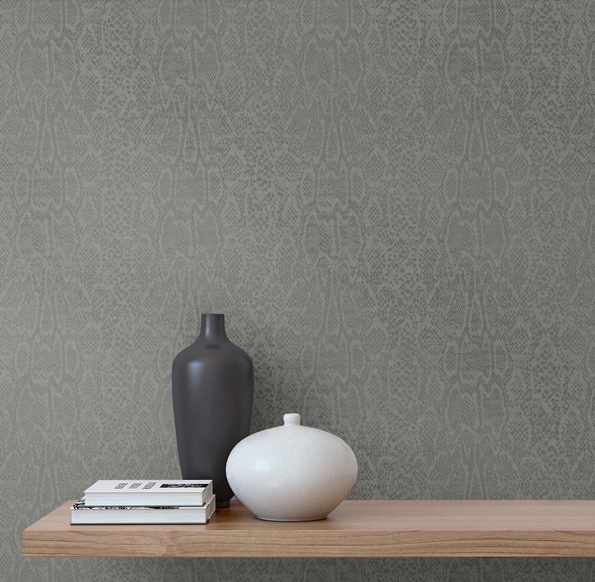 Aura Skin – Silver and Charcoal | Silvers and Pewters Animals, Birds and Insects Wallpaper for Kitchen, Nursery, and Powder Room