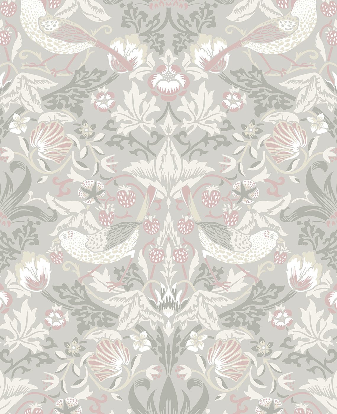 Fragaria Garden – Light Grey and Rose Petal | Grays Animals, Birds and Insects Wallpaper for Bedroom, Entryway, and Office