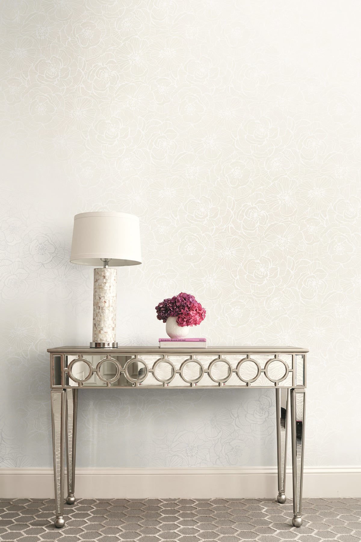 Adorn – Metallic Silver, Off-White, and Tan | Silvers and Pewters Florals, Botanicals and Tropicals Wallpaper for Hallway, Entryway, and Living Room