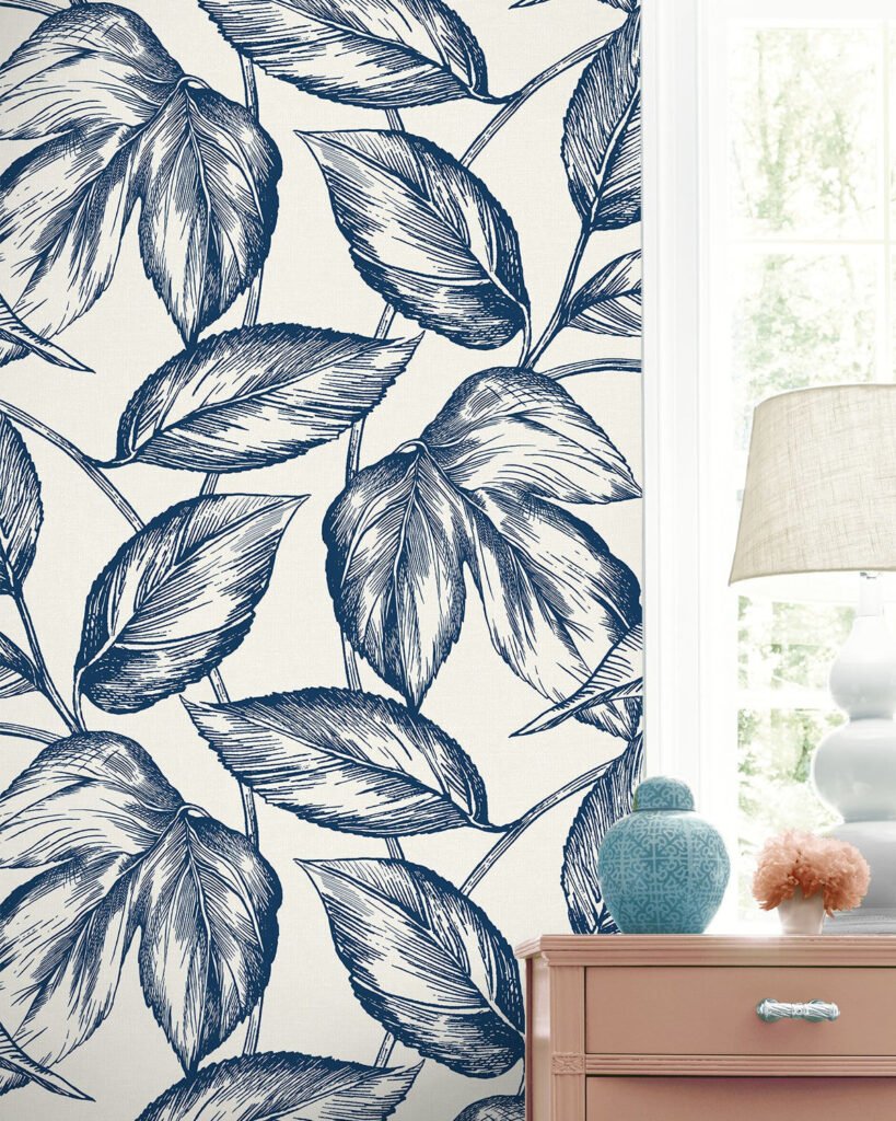 Enhance your space with this Blues Trees and Leaves Wallpaper, perfect for accent wall, office, and powder room.