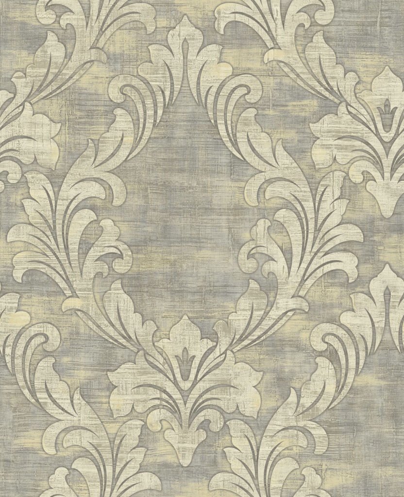 Kepler Damask – Metallic Pearl and Gray | Grays Damasks and Scrolls Wallpaper for Office, Powder Room, and Nursery