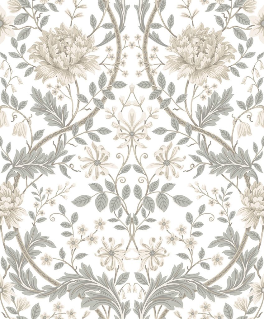 Honeysuckle Floral Ogee – Ivory and Greige | Whites and Off Whites Damasks and Scrolls Wallpaper for Dining Room, Entryway, and Hallway