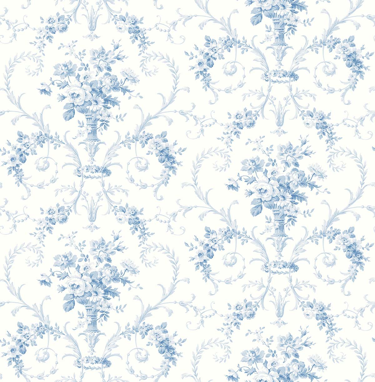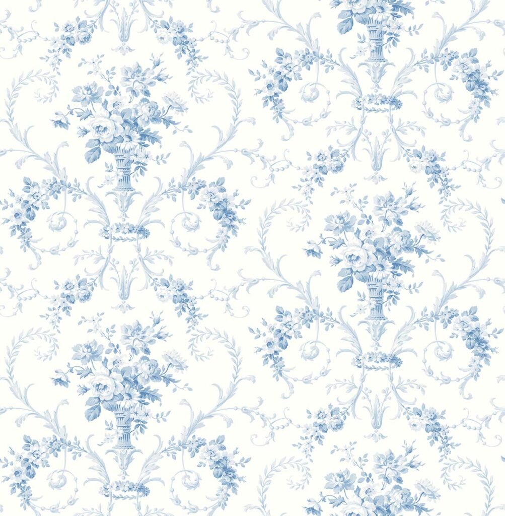 Enhance your space with this Blues Damasks and Scrolls Wallpaper, perfect for half bath, nursery, and hallway.