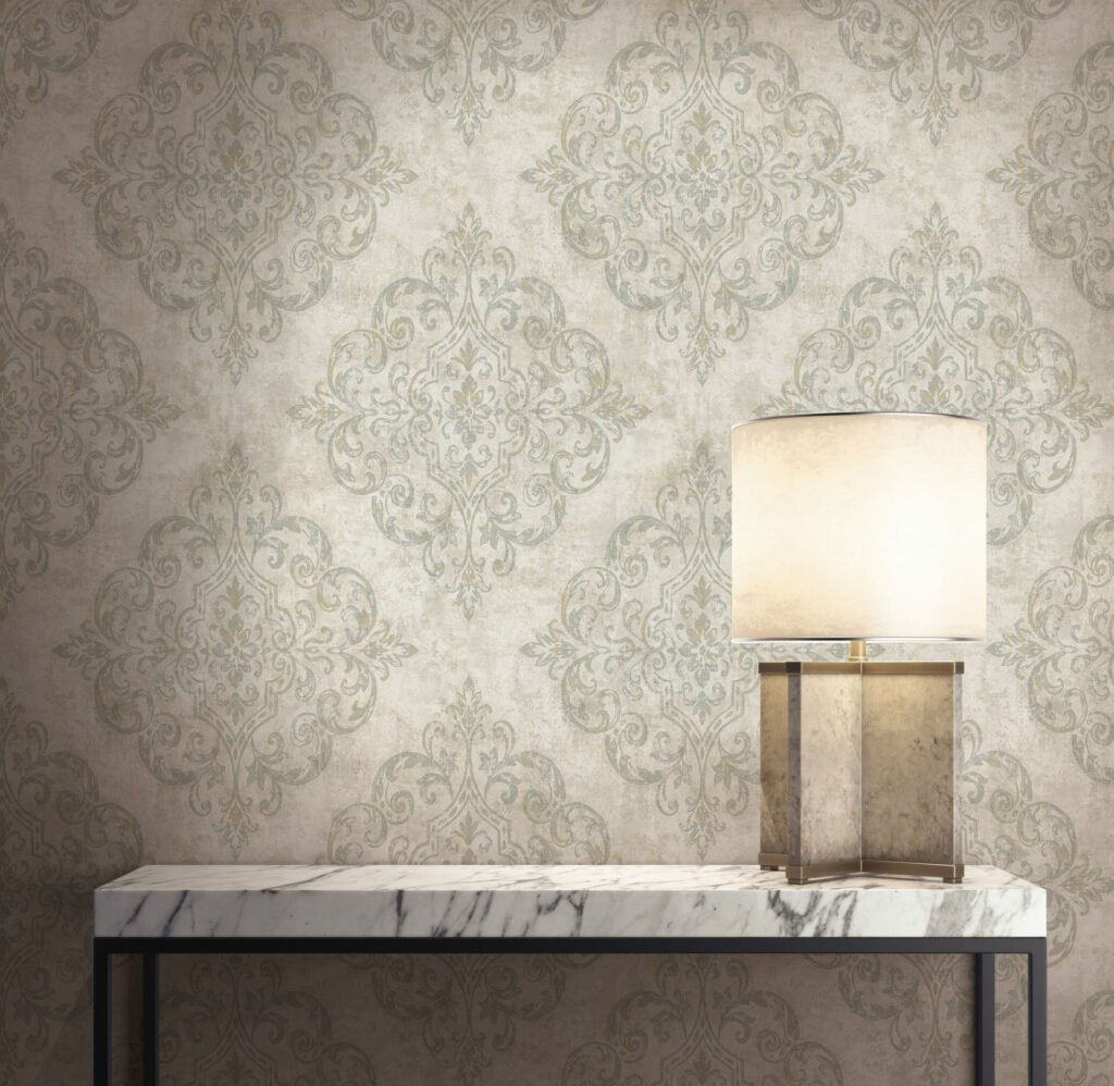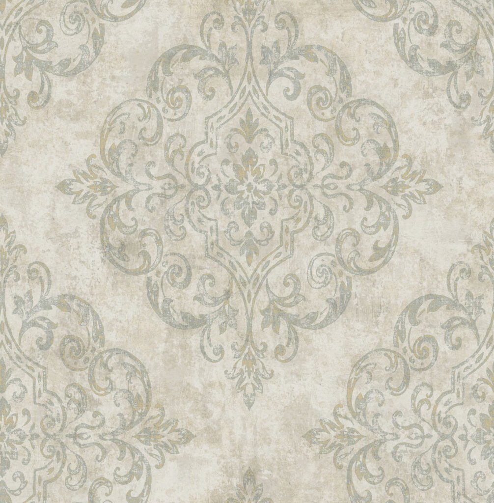 Atelier – Gray, Metallic Gold, and Taupe | Grays Damasks and Scrolls Wallpaper for Bedroom, Hallway, and Living Room