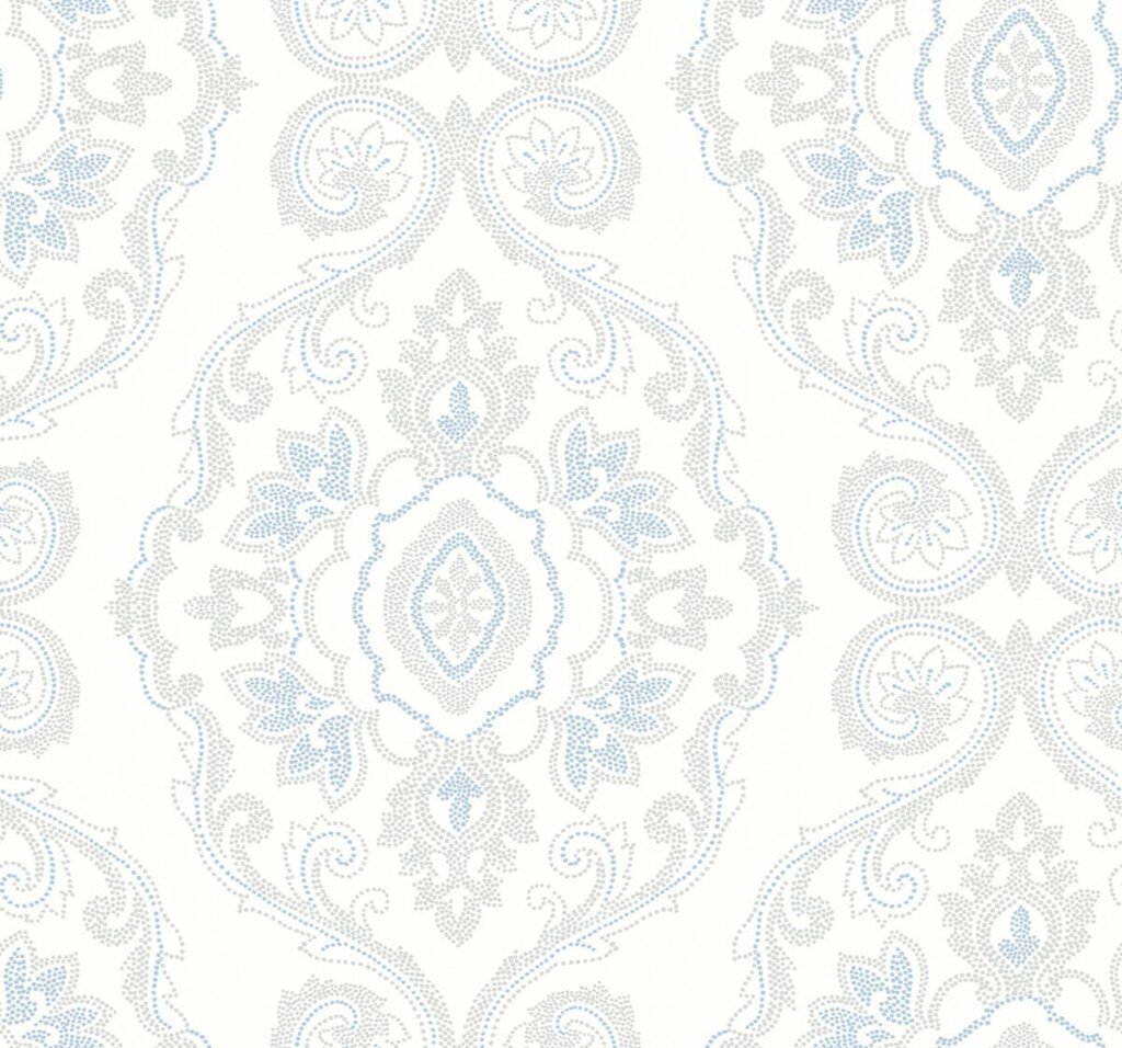 Enhance your space with this Blues Damasks and Scrolls Wallpaper, perfect for hallway, dining room, and powder room.
