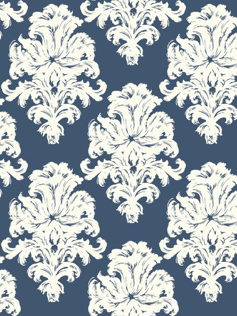 Montserrat – Prussian Blue and White | Blues Damasks and Scrolls Wallpaper for Half Bath, Kitchen, and Bedroom